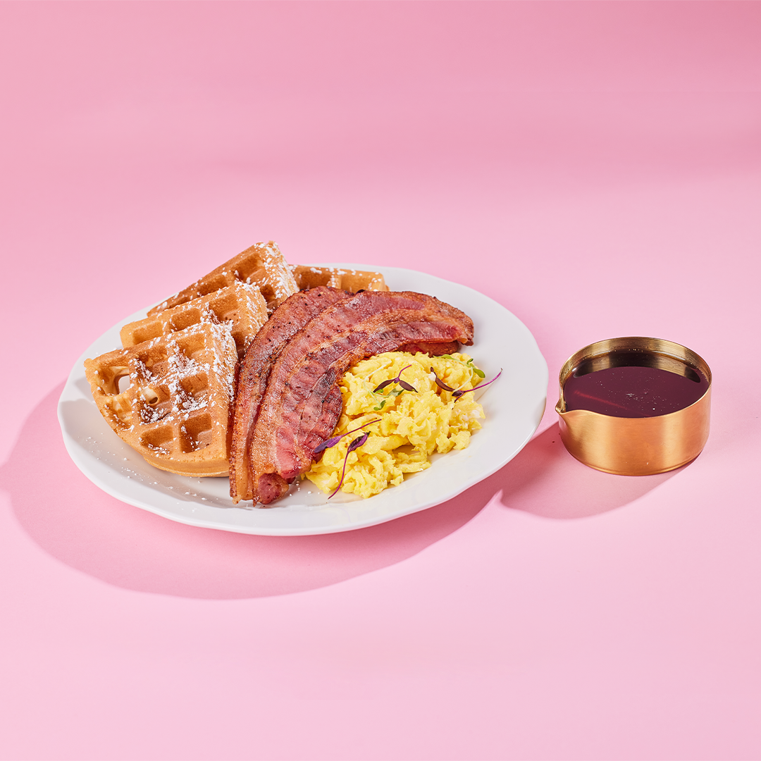 YOUR CHOICE OF PANCAKES, TOASTED BREAD OR WAFFLE WITH EGGS AND BACON