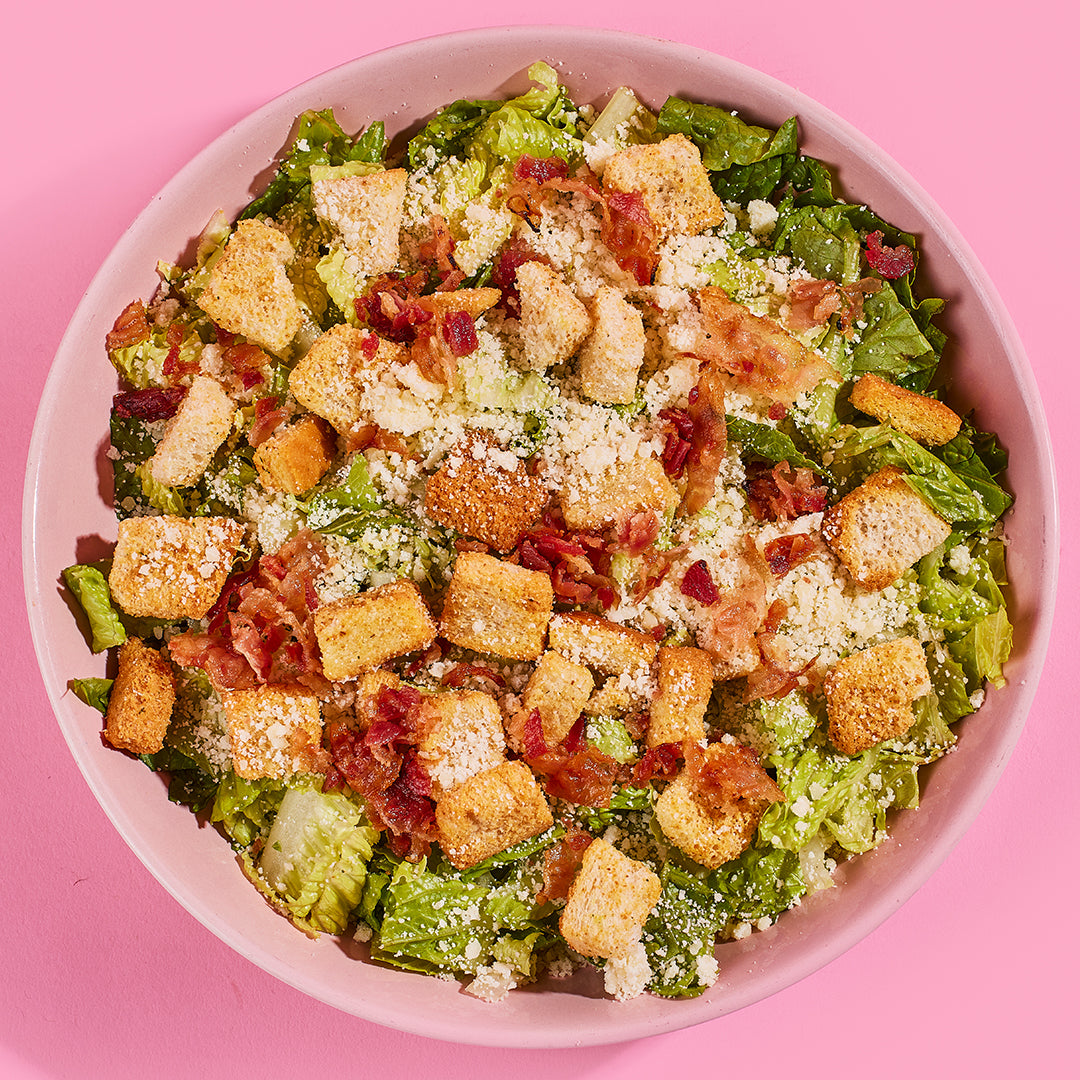 LETTUCE MIX TOPPED WITH PARMESAN CHEESE, BACON AND CROUTONS SERVED WITH CAESAR DRESSING