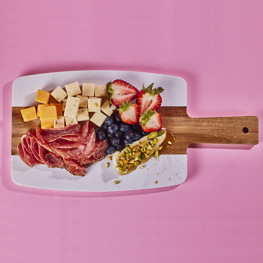SIX VARIETIES OF CHEESE AND CURED MEATS WITH FRUITS AND BACON WRAPPED DATES FILLED WITH GOAT CHEESE