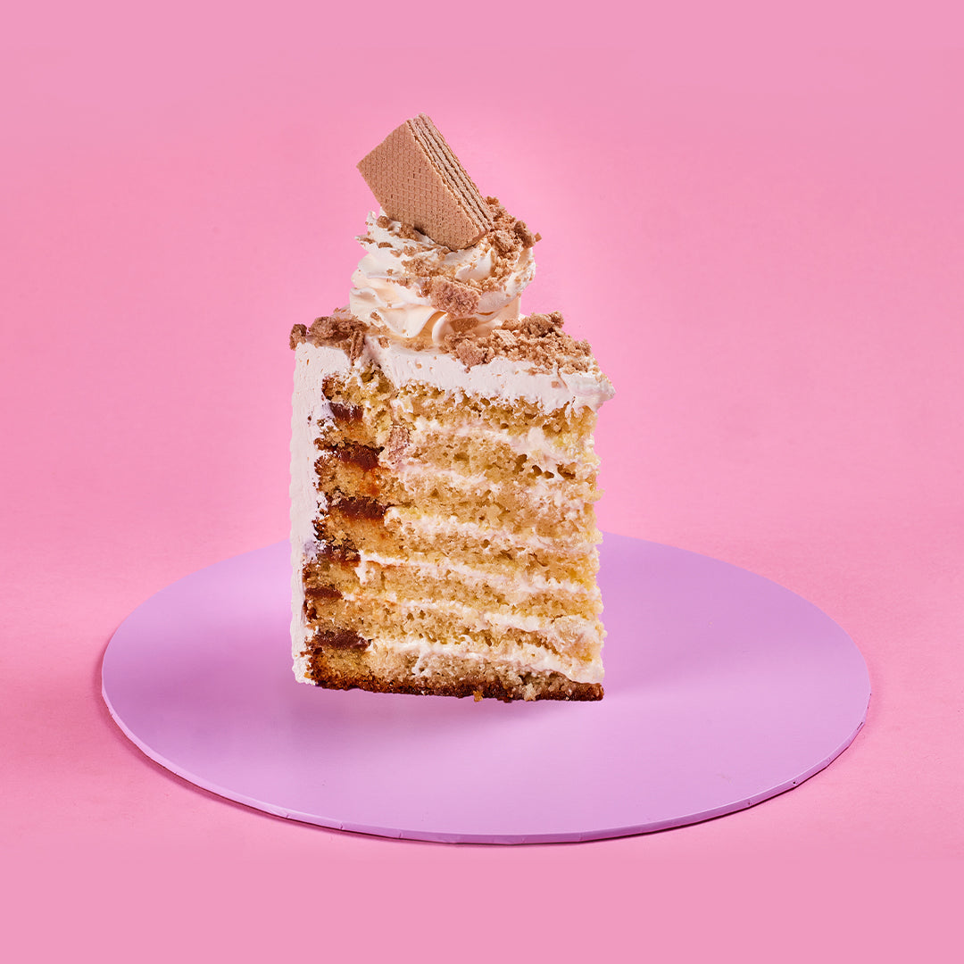 THIN LAYERED CAKE FILLED WITH A WAFER COCONUT COOKIE FILLING AND WHITE CHOCOLATE.