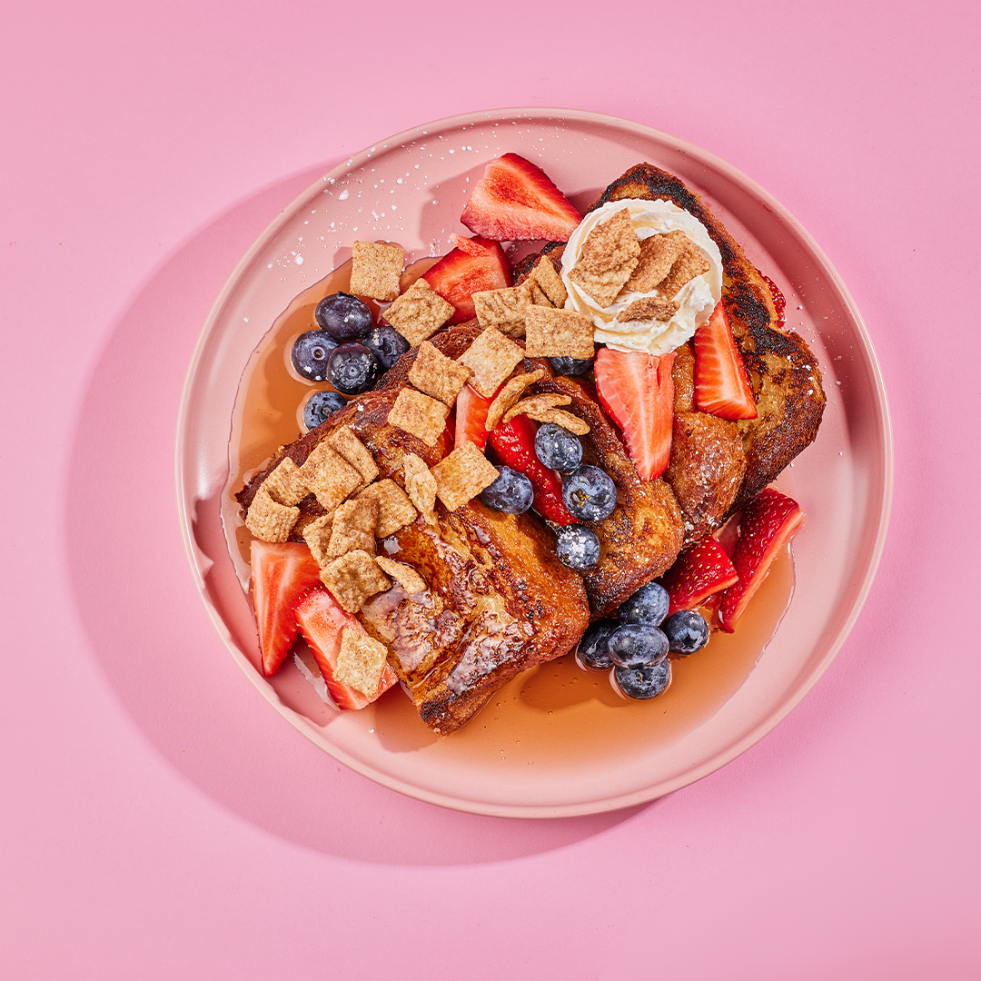 SUPER MOIST BRIOCHE BREAD SLICE TOPPED WITH BERRIES, CONDENSED MILK AND CINNAMON CRUNCH