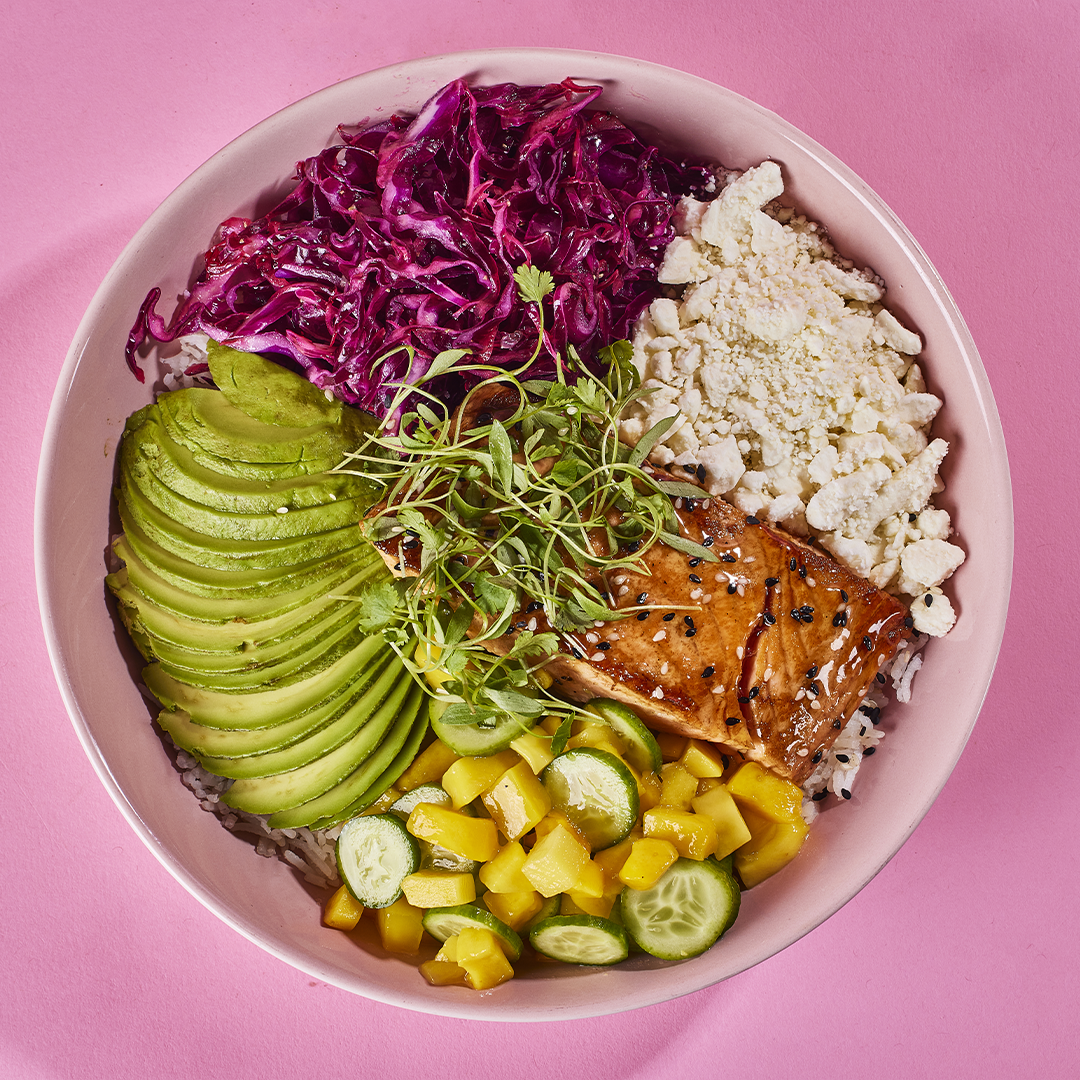 GRILLED SALMON, AVOCADO, LEMON RED CABBAGE, MANGO/CUCUMBER SALAD AND FETA CHEESE OVER RICE