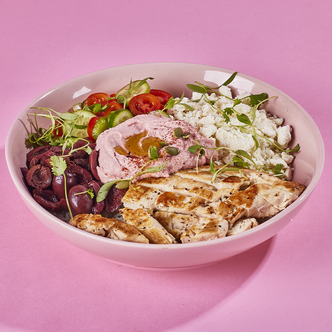 GRILLED CHICKEN, BEET HUMMUS, TOMATO/ CUCUMBER SALAD, FETA CHEESE AND KALAMATA OLIVES OVER RICE.