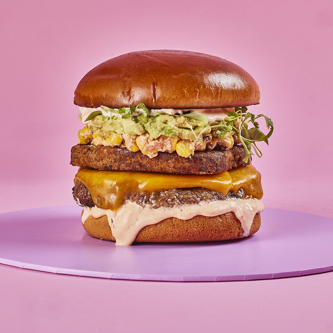 BEEF PATTY TOPPED WITH AVOCADO, , CORN MIXED WITH CHEESE, BLACK BEANS PATTY, CILANTRO AND PINK KEIK SAUCE