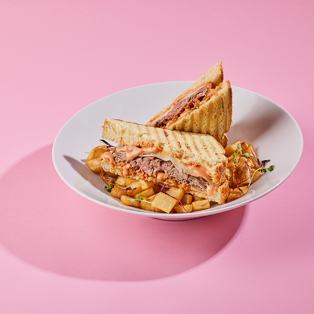 TOASTED BREAD FILLED WITH ROAST BEEF, PICKLES, SWISS CHEESE, KEIK SAUCE AND CRISPY ONIONS (INCLUDES BREAK)