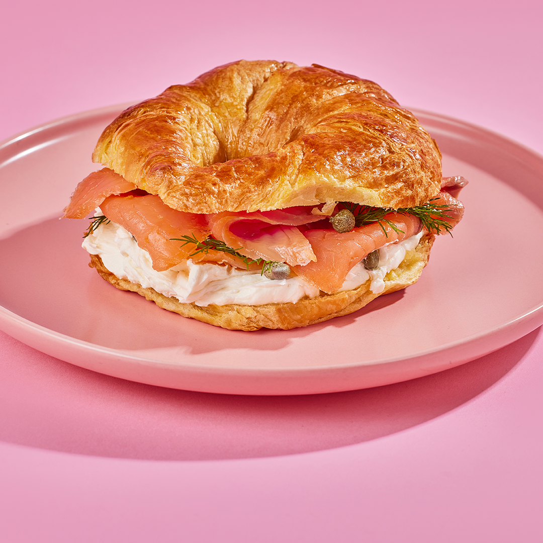CROISSANT FILLED WITH CREAM CHEESE, SMOKED SALMON, PICKLED ONION, DILL AND CAPERS.