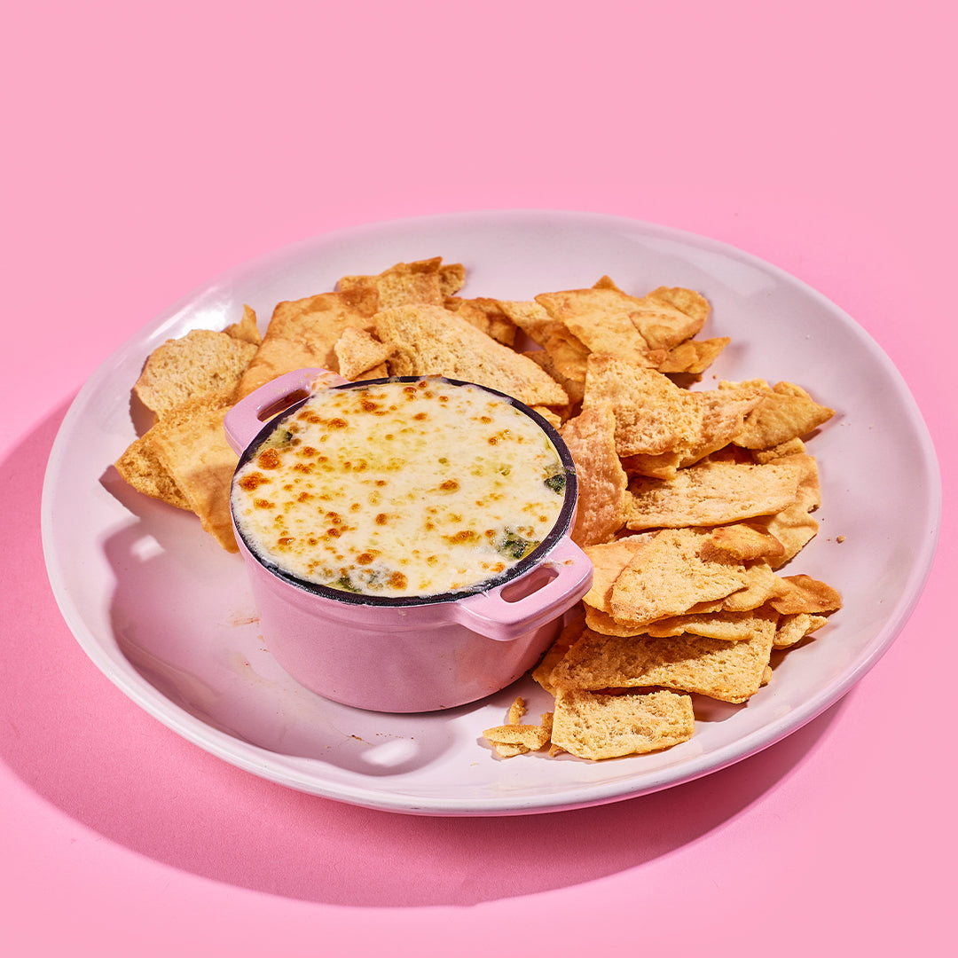 MOZZARELLA,, SPINACH AND ARTICHOKE DIP SERVED WITH PITA CHIPS